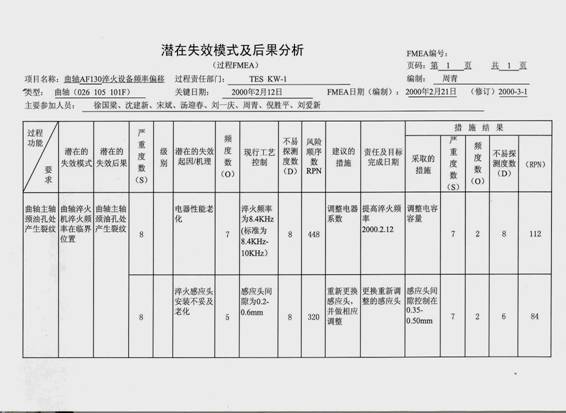 在这个表格当中发现的情况一旦发生,严重度数是8分,严重后果是8级。其时效的原因可能是淬火机的电器性能老化;第二种可能是淬火感应头的安装位置错误,对淬火的频率造成影响。然后再对这两种原因各自产生的频率大小进行评估,发现性能老化的的频度数是7分,而淬火感应头安装错误是5分。发现性能老化的不易探测数是8分,淬火感应头安装错误也是8分。