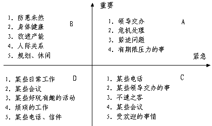 如图1所示,横坐标轴代表事情的紧急程度,纵坐标代表事情的重要程度,就可以将所有工作分为A、B、C、D四个象限,A象限是既重要又紧急的事情,B象限是重要但不紧急的事情,C象限是紧急但不重要的事情,D象限是既不重要也不紧急的事情。